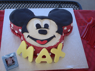 Max & Elijah's 2nd birthday cakes. Surprisingly, probably my most challenging cake to date. I had to work w/ two mediums in an unusual pattern. I don't often make cakes decorated only in buttercream, but this was a combination of vanilla buttercream and black Satin Ice fondan for the mouse ears. I used a crusting buttercream, which was not completely smooth before placing the fondant ears on. The challenge was not bleeding the red w/ the beige. Turned out well, tasted great and the mom's were happy!